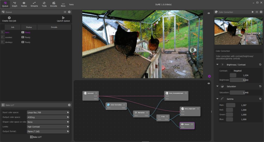 Thanks to its nodal view, it’s easy to manage the streams, mix them, add filters, correction and adjustment nodes… DuME benefits from more than 450 media filters from libavfilter, and more and more filters are natively supported like color correction nodes, denoising, stabilization (deshaking), crop and resize, etc. - Color Management