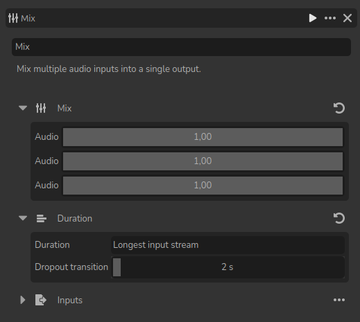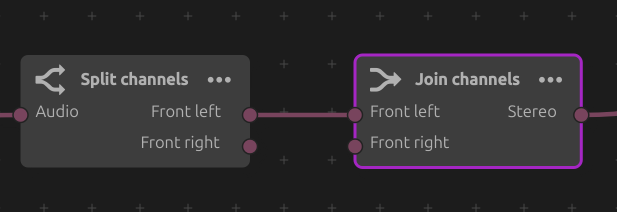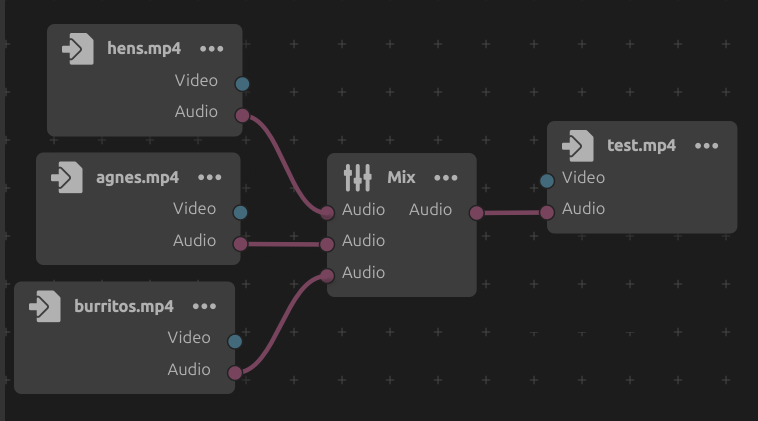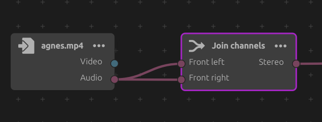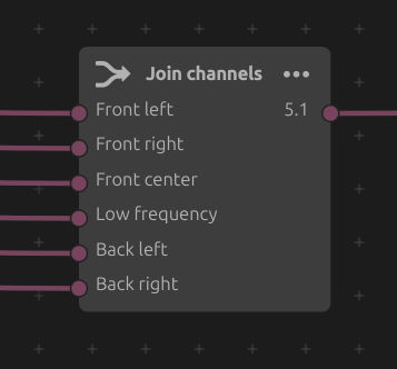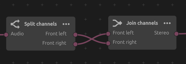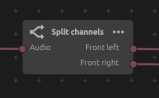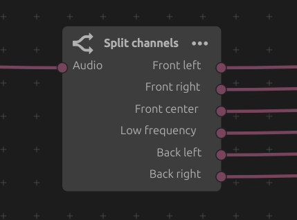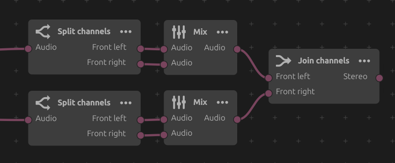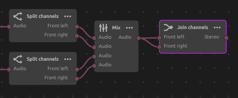 Using the Mix node, you can combine multiple streams together. The number of channels and their layout is automatically handled, but if you have specific needs, it is easy to combine this node with the other nodes described here.