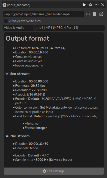 According to the chosen format, you can then adjust advanced settings, like choosing the codec, the audio sampling rate, etc. by clicking the Edit settings button, where you’ll find the parameters for video, audio, and custom FFmpeg settings.