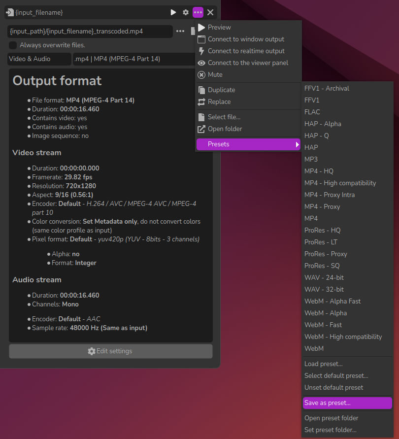 Other formats may be adjusted using custom FFmpeg parameters. To make it easier to re-use your settings without having to set everything every time you need them, you can use presets. A bunch of presets are included with DuME but you can create your own presets and change the default preset throught the node menu.