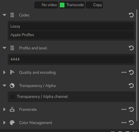 You can also select the Profile, and with one of the 4444 profiles, you may also check the Transparency / Alpha option if you need to keep the transparency in the output file. Checking the Transparency option with Proxy, LT, SQ or HQ options have no effect as these profiles can’t store the alpha channel.