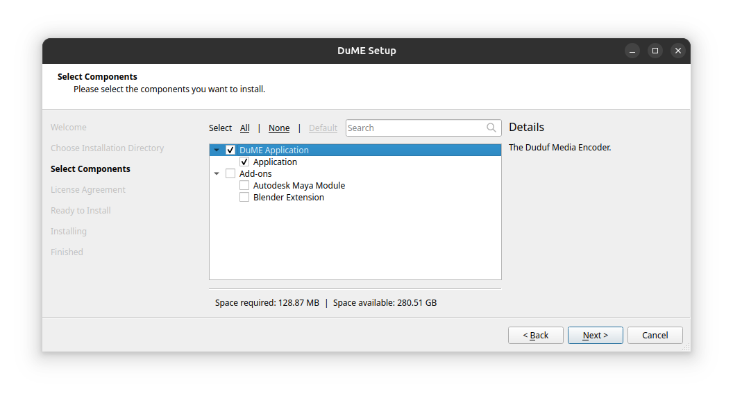 A portable version is downloadable as a .tar.xz archive; this version may be used on any computer even if you don’t have admin rights, and can be saved to an external device like a USB drive. Just unzip all the files on your drive, and run dume to launch DuME.