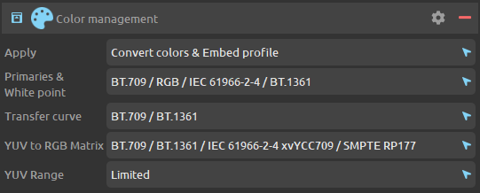 The first parameter “Apply” can change the way DuME manages the colors. By default, it will both convert the colors and try to set the metadata in the output file (embed color profile). You can also set it to just convert the colors, or to just add the metadata.