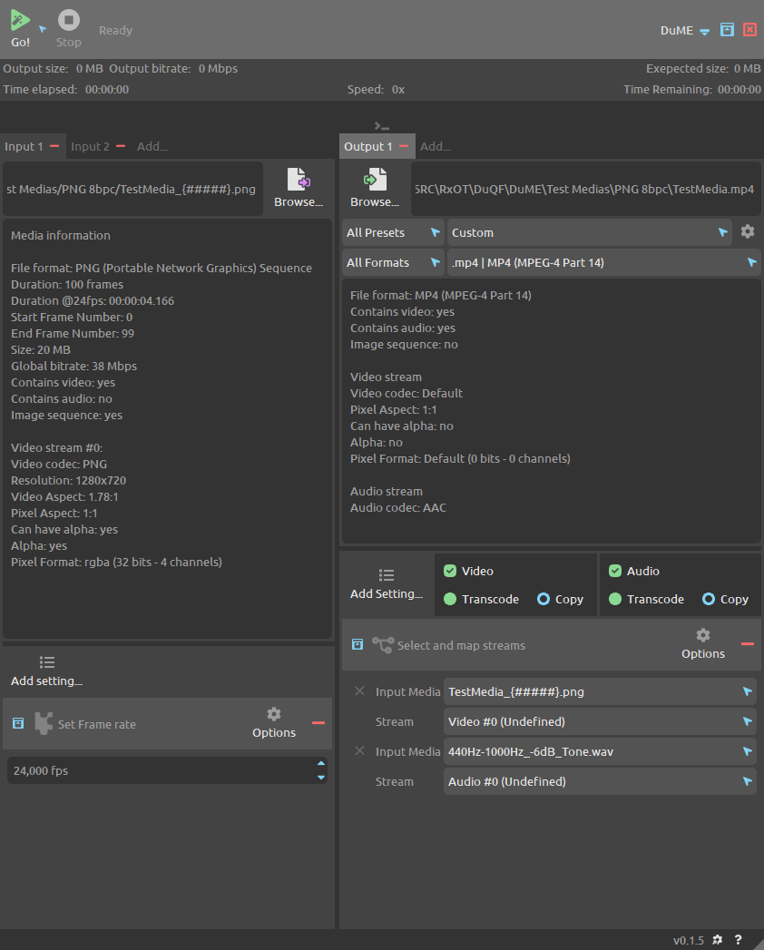 If the output file can contain only a limited number of streams (e.g. one video and one audio stream, like mp4), and there are more available streams in the input medias, DuME will automatically select the best-quality streams it can find from all the input medias. If you want to manually select specific streams, read the section below entitled Changing / Mapping streams.