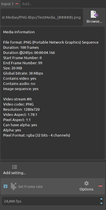 To load image sequences as input medias in DuME, select or drag and drop a single image from the sequence. It can be any frame, not necessarily the first one. DuME automatically detects the complete sequence.